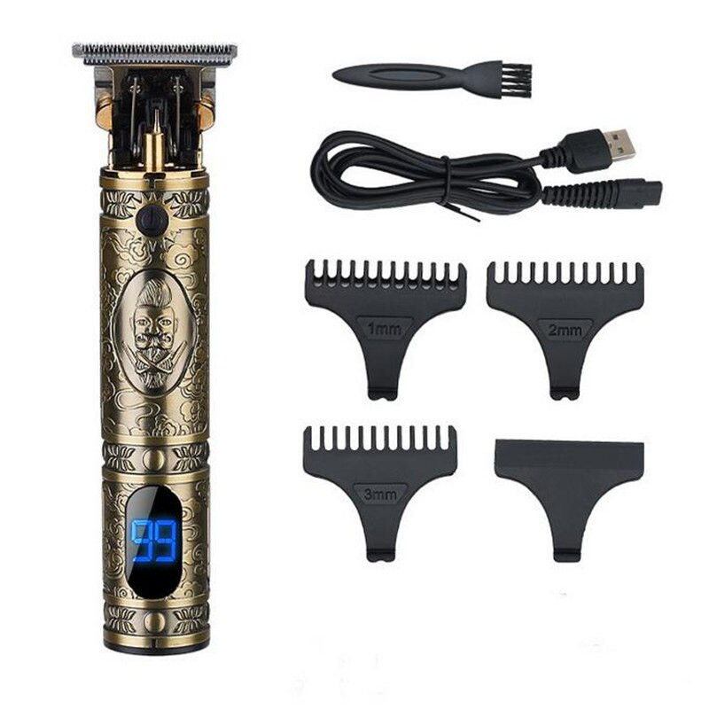 Hermosa patillera profesional tipo esqueleto con Blade hoja T de acero al carbono de corte estrecho para forrar, diseñar y afeitar en seco-sin grietas. Recargable y de uso inalámbrico, cuenta con pantalla LED indicadora de cargar y lubricación. Incluye accesorios para un trabajo completo y prolijo.