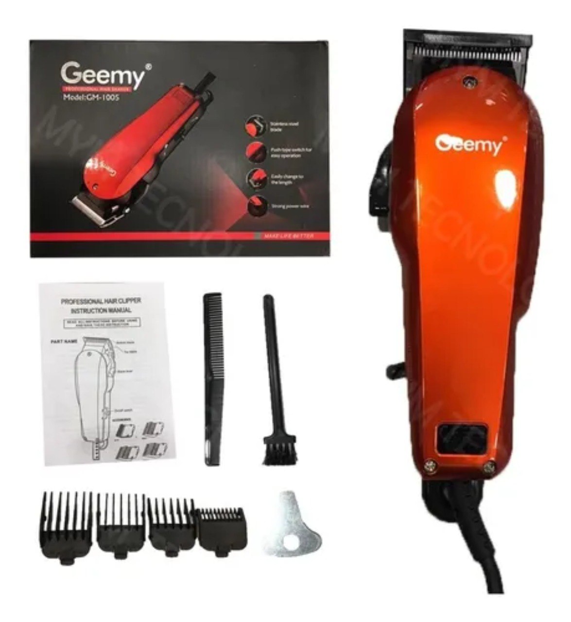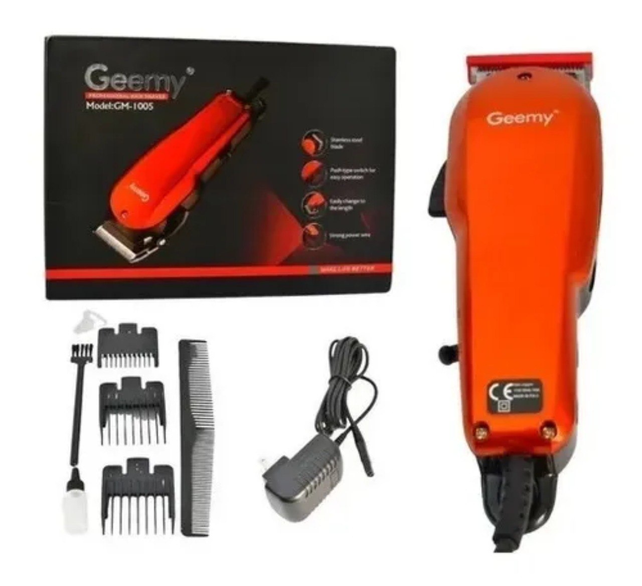 Nueva máquina cortadora de pelo personal Pro Gemey GM-1005 + Accesorios Gemy pelo profesional Clipper GM-1005 El Gemey Profesional cortadora de cabello es excelente para su uso personal para el corte de alta resistencia que se estrecha fundidos y mezclados equipado con la nueva tecnología de motores innovadora Esta nueva motor que funciona más rápido y más fresco con un poder de corte de 40% más Esta se completa con un protector de la hoja 4 de fijación peina pequeño peine superior plana limpieza aceite cepillo podadoras y un folleto de instrucciones Características: Para corte delicado Tiene cuchillas de acero inoxidable Llave de Abrir / Apagar Muy fino, ligero y silencioso Corriente directa 110V Accesorios incluidos Lo que obtienes con tu compra: – 1 x Máquina – 1 x Protector de cuchilla – 4 x Niveles de corte 3mm – 6mm – 9mm – 12mm – 1 x Peine – 1 x Brocha – 1 x Aceite lubricante – 1 x Manual