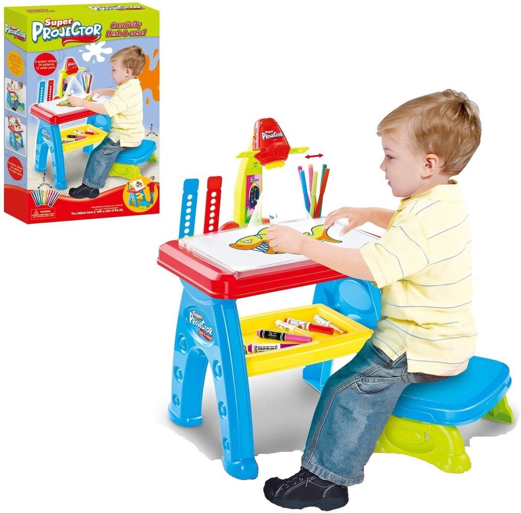 Además, el escritorio tiene una bandeja donde guardar los accesorios. El proyector tiene todo lo que se necesita, incluidos 6 discos con 8 dibujos cada uno.