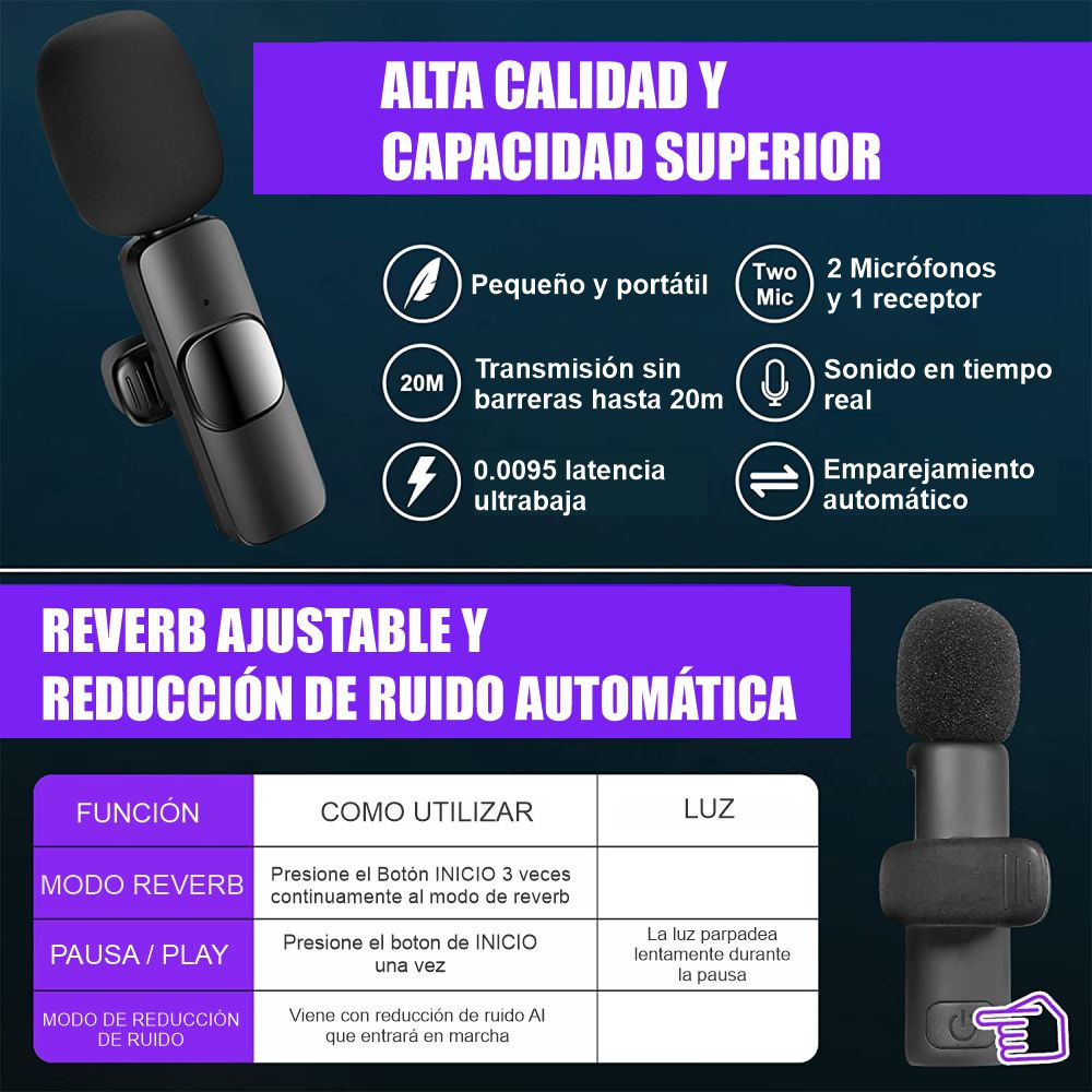2 x Microfonos 1 x Receptor 1 x Cable de carga 1 x Manual de usuarioFrecuencia: 2.4GHz