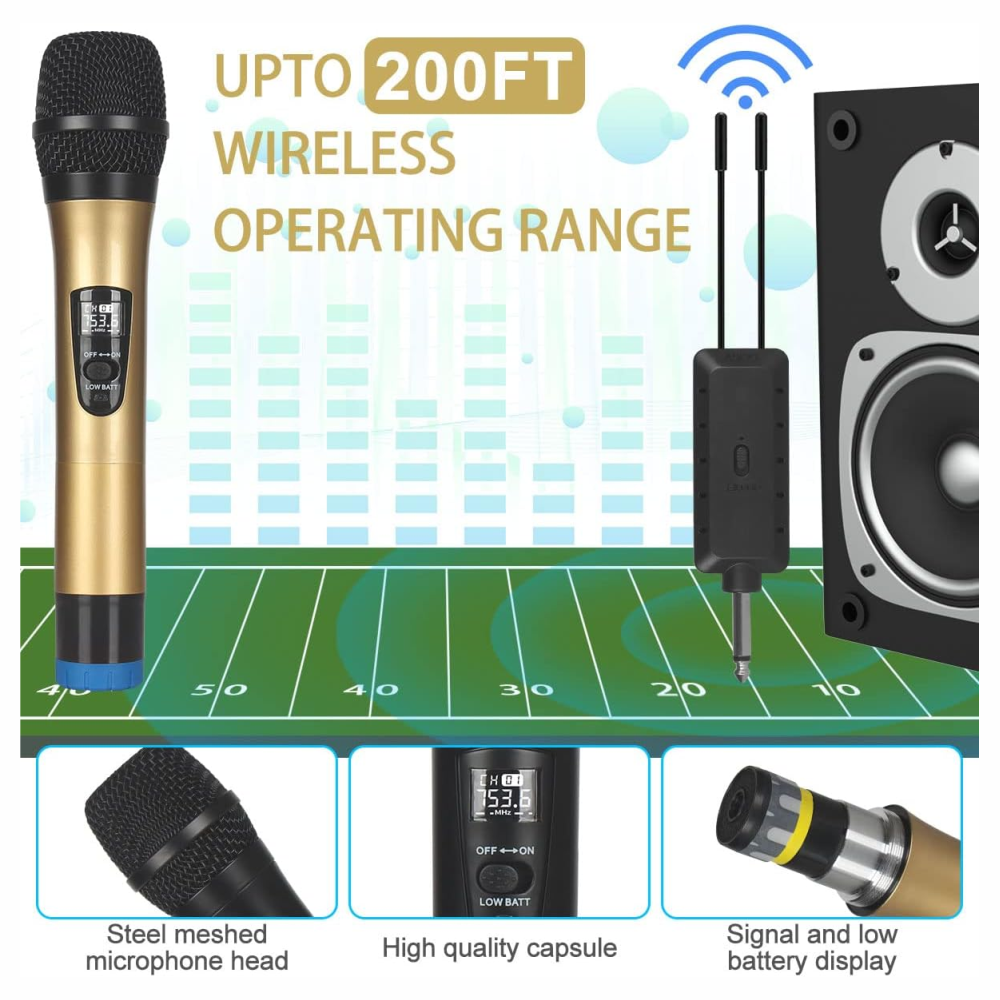 Viene con receptor UHF de 6,35 mm, compatible con altavoz, kraraoke sistema, sistema de cine en casa, amplificador, tarjeta de sonido, mezclador, etc.