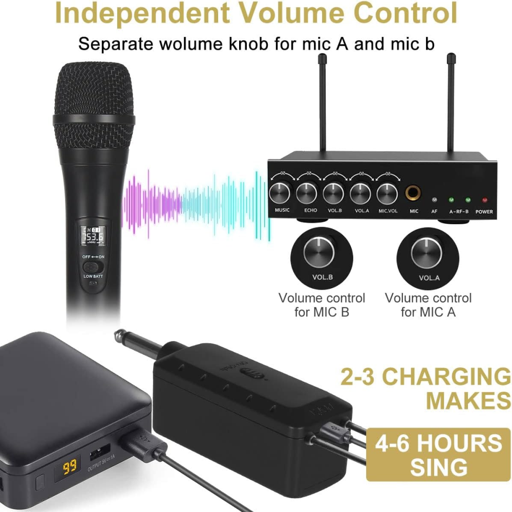 2 micrófonos de karaoke: Los micrófonos inalámbricos UHF se han actualizado y utilizan la última tecnología de frecuencia súper alta para garantizar señales estables al cantar.