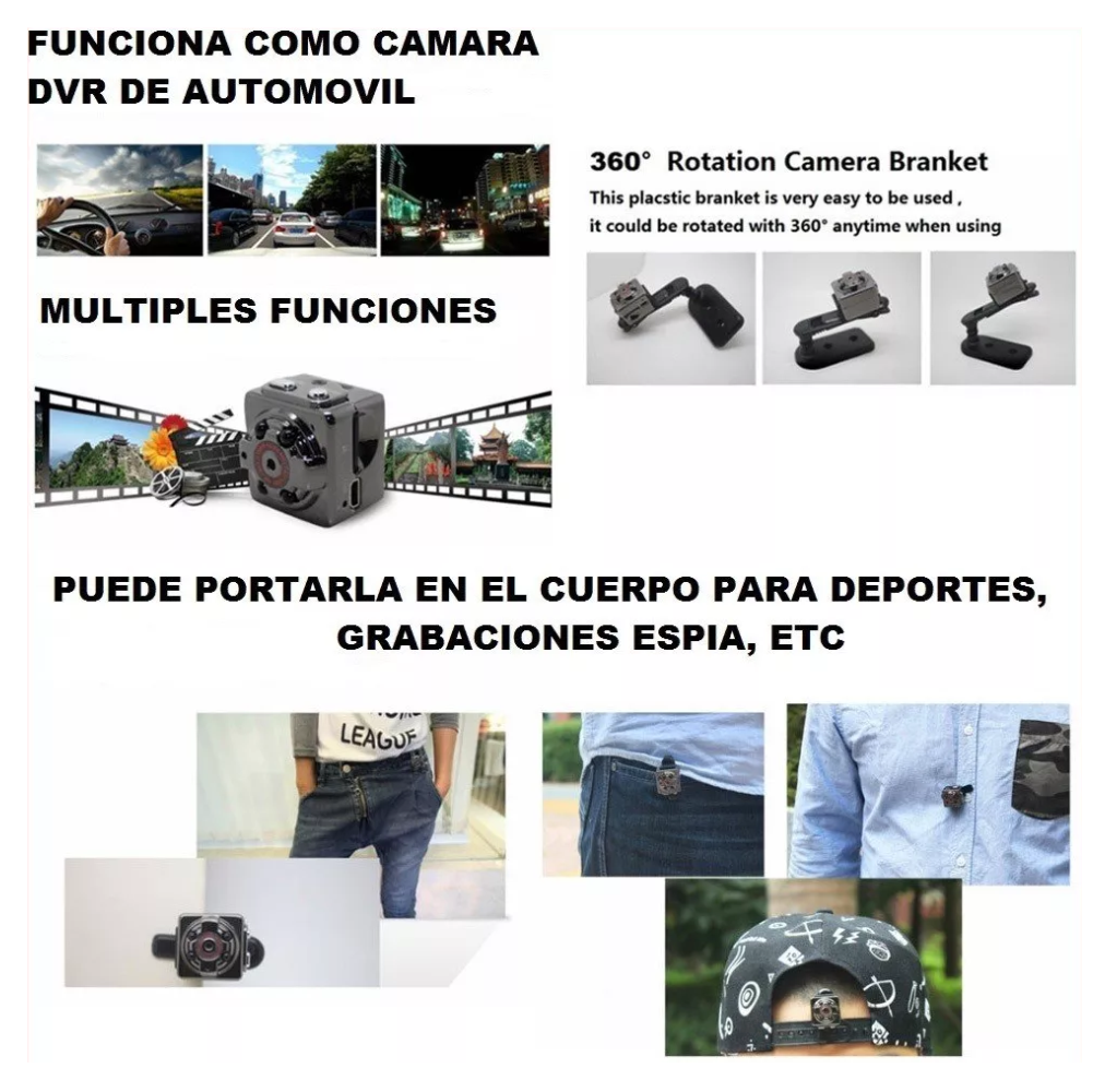 Lo que obtienes con tu compra: 1 x Mini cámara 1 x Cable USB 1 x soporte 1 x Clip 1 Manual de usuario (idioma español no garantizado)