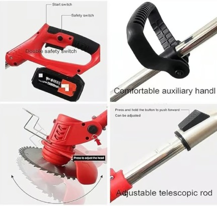 [POWER] -Es adopta un motor de alta calidad, la potencia es de hasta 800W, la resistencia a alta temperatura. [Resistencia] – Adopte batería recargable de gran capacidad, energía eléctrica fuerte, traiga poder duradero. [Interruptor de seguridad]: equipado con un interruptor anti-toque, debe mantener presionado el interruptor anti-toque al comenzar, y luego presione el interruptor de inicio. [Diseño ajustable] – Mantenga presionado el botón retráctil para extender fácilmente la varilla de operación, hasta 1-30 cm; la posición de la manija cómoda se puede ajustar a voluntad, y el agarre es cómodo. [Cabeza ajustable]: la cabeza de la máquina se puede ajustar por 90 °, resolver fácilmente el problema del ángulo muerto.