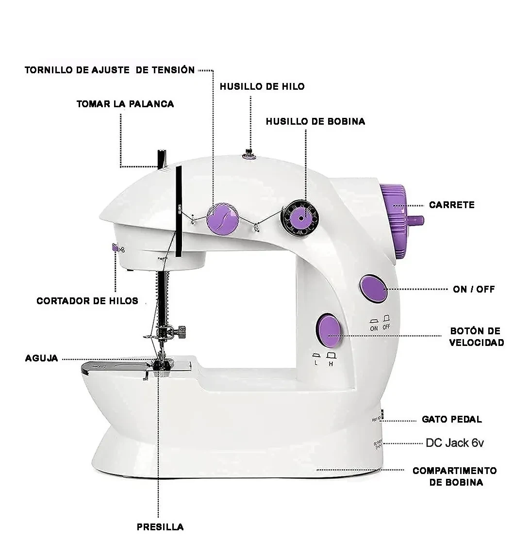 La máquina de coser tiene dos modos de arranque, interruptor de botón manual o un pedal; dos modos de alimentación, ya sea con el cable de alimentación o con la batería (atención: la batería y el cable de alimentación no se pueden utilizar al mismo tiempo).