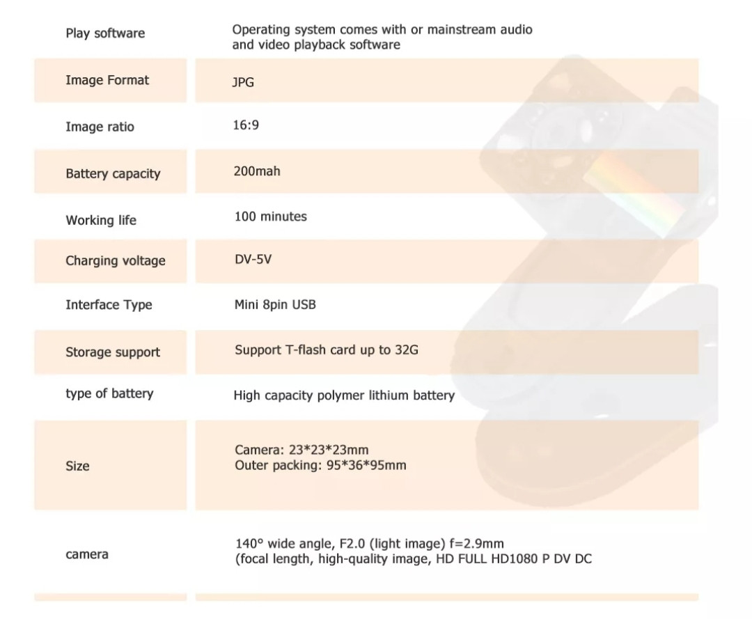 Battery type: built-in 200mAh Working time: about 100 minutes at 1080p