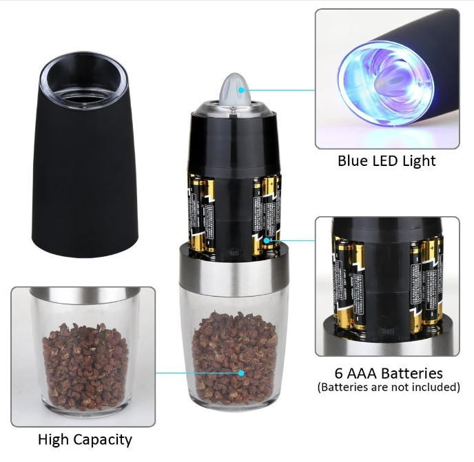 - Fácil de usar: el molinillo electrónico de pimienta utiliza un diseño avanzado de detección de gravedad, sin molienda manual, sin operación de botón, simplemente gira el molino, comienza a moler automáticamente. Es fácil de hacer con una mano y tienes especias frescas, sal o pimienta. Funciona con 6 pilas AAA (no incluidas).