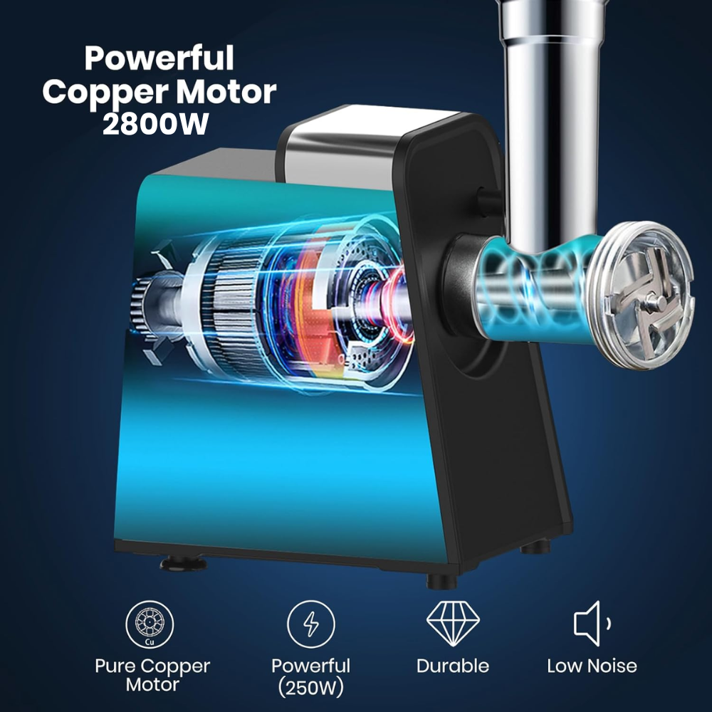 Potente rendimiento: esta picadora de carne compacta cuenta con un motor de cobre puro sólido con una potencia nominal de 2800 W para garantizar un rendimiento eficiente y duradero. Proporciona una potencia estable, durabilidad extendida y menos ruido, lo que te ofrece una experiencia de usuario agradable. Además, sobresale en la molienda de carne de res y otros tipos de carne, por lo que es una excelente opción para diversas tareas culinarias.