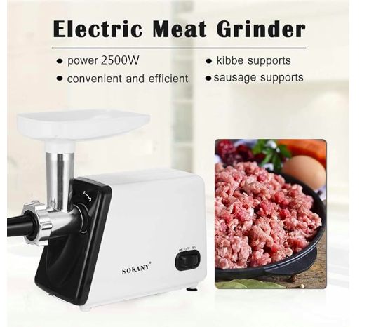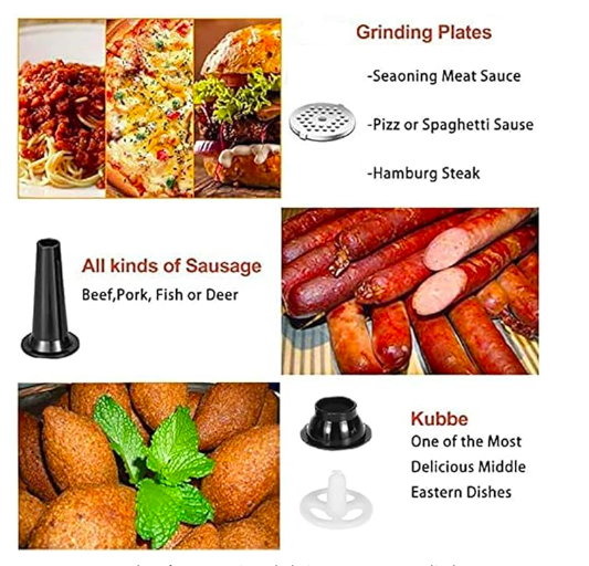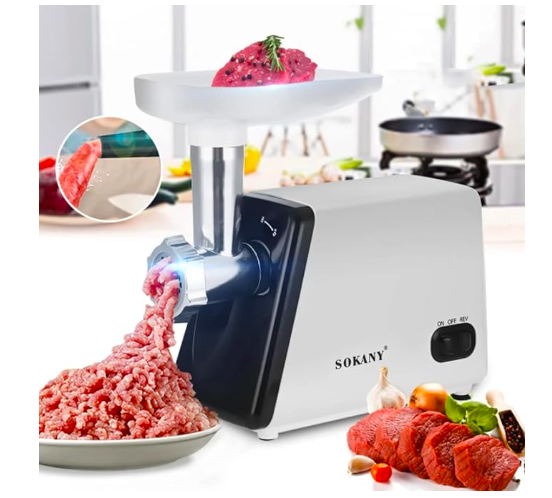 - Robot de cocina multifunción: Picadora de carne eléctrica SOKANY para rellenar y llenar. Picadora de carne con 3 diferentes accesorios de corte para carne gruesa, media y fina. Con varios accesorios que pueden satisfacer sus necesidades de cocina, como picar carne, preparar kubbe, preparar salchichas como una máquina de salchichas.