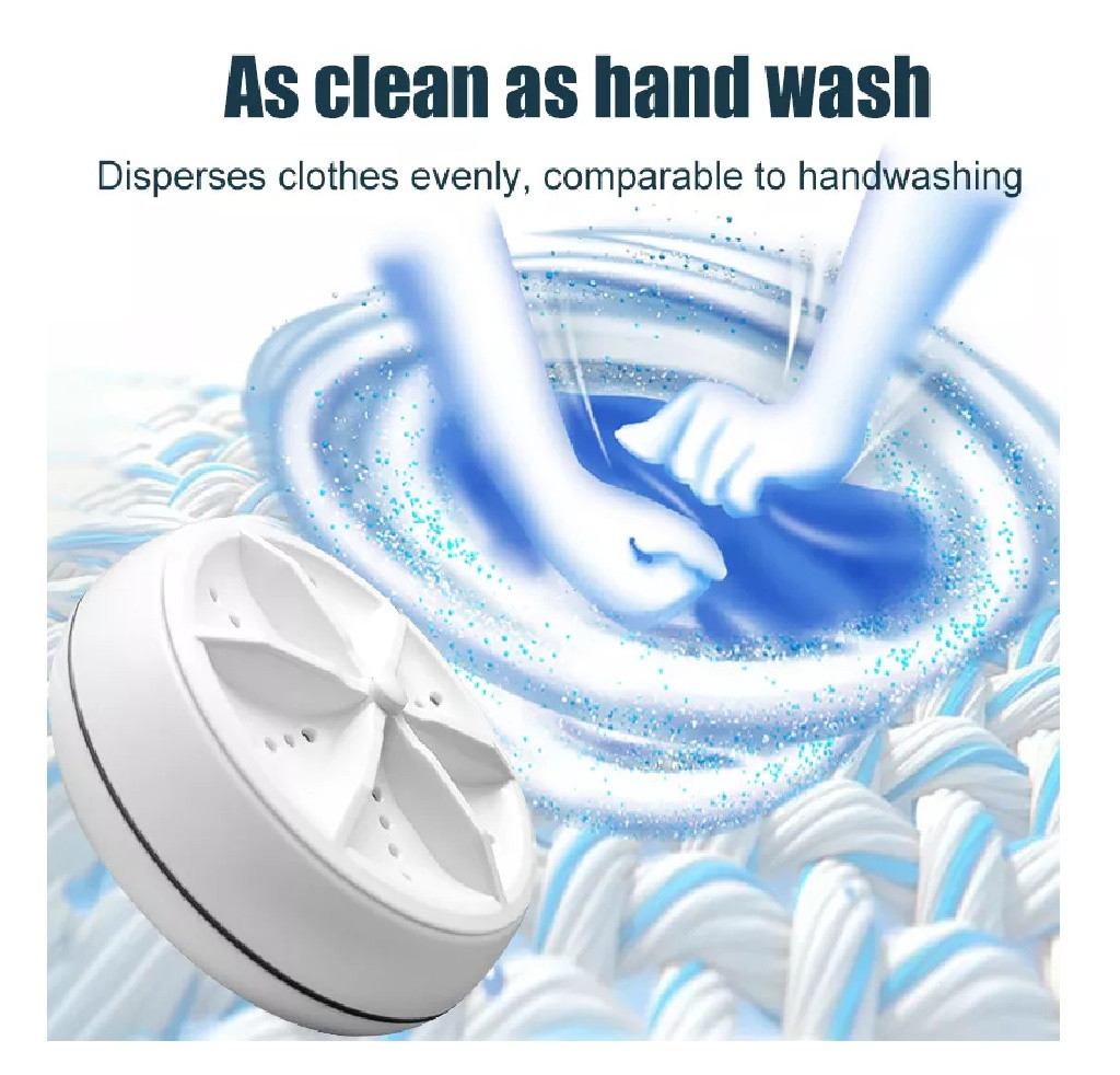 Mini lavadora con turbinas de alta frecuencia, ultrasonidos y burbujas para limpiar alternativamente, eliminar la suciedad y hacer la limpieza con eficiencia. Tamaño compacto de 3.7 pulgadas de diámetro con 9.5 oz de peso ligero, súper fácil de transportar, perfecto para viajes, apartamentos, dormitorios, etc.