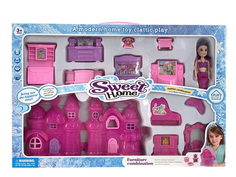 Casa de juegos para niñas, dos muñecas y juego de sala y puesto de belleza. Nombre del producto Casa Hogar Familiar Para Niños