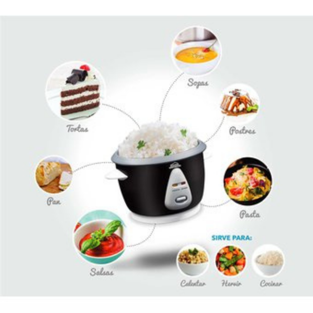 Olla arrocera 1 litro, para cocinar 5 a 7 porciones, con recipiente antiadherente removible fácil para lavar; con tapa de doble escape del vapor que regula la temperatura y da calor constante.