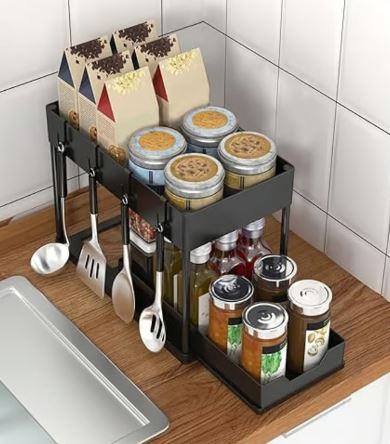 Estante de fregadero, 1/2 estante deslizante de almacenamiento para gabinete, estante de almacenamiento ajustable para debajo del fregadero, estante de almacenamiento tipo cajón multifuncional, estante de fregadero de cocina y baño multiusos, cesta de almacenamiento, estante de almacenamiento para debajo del lavabo del baño.