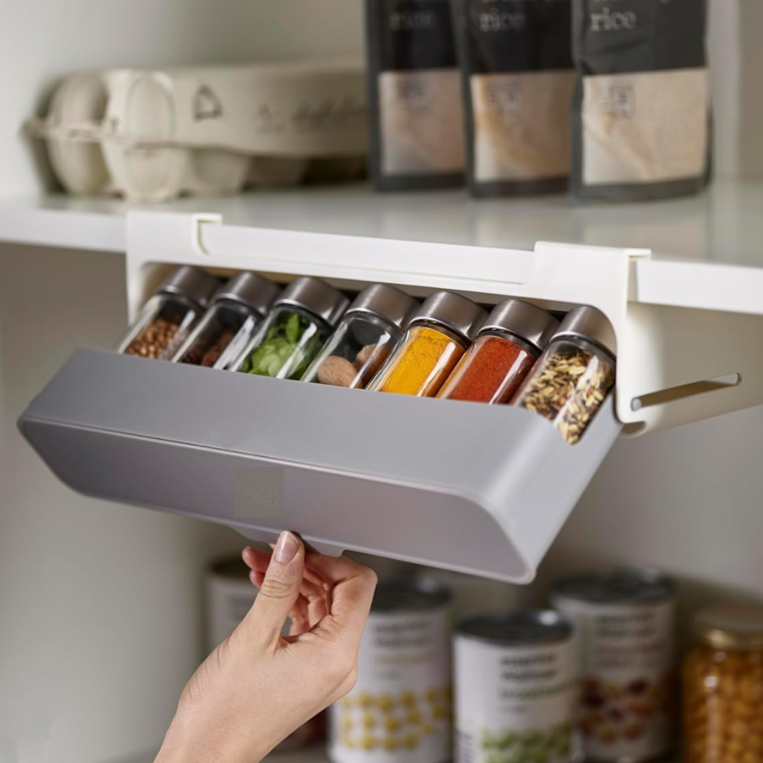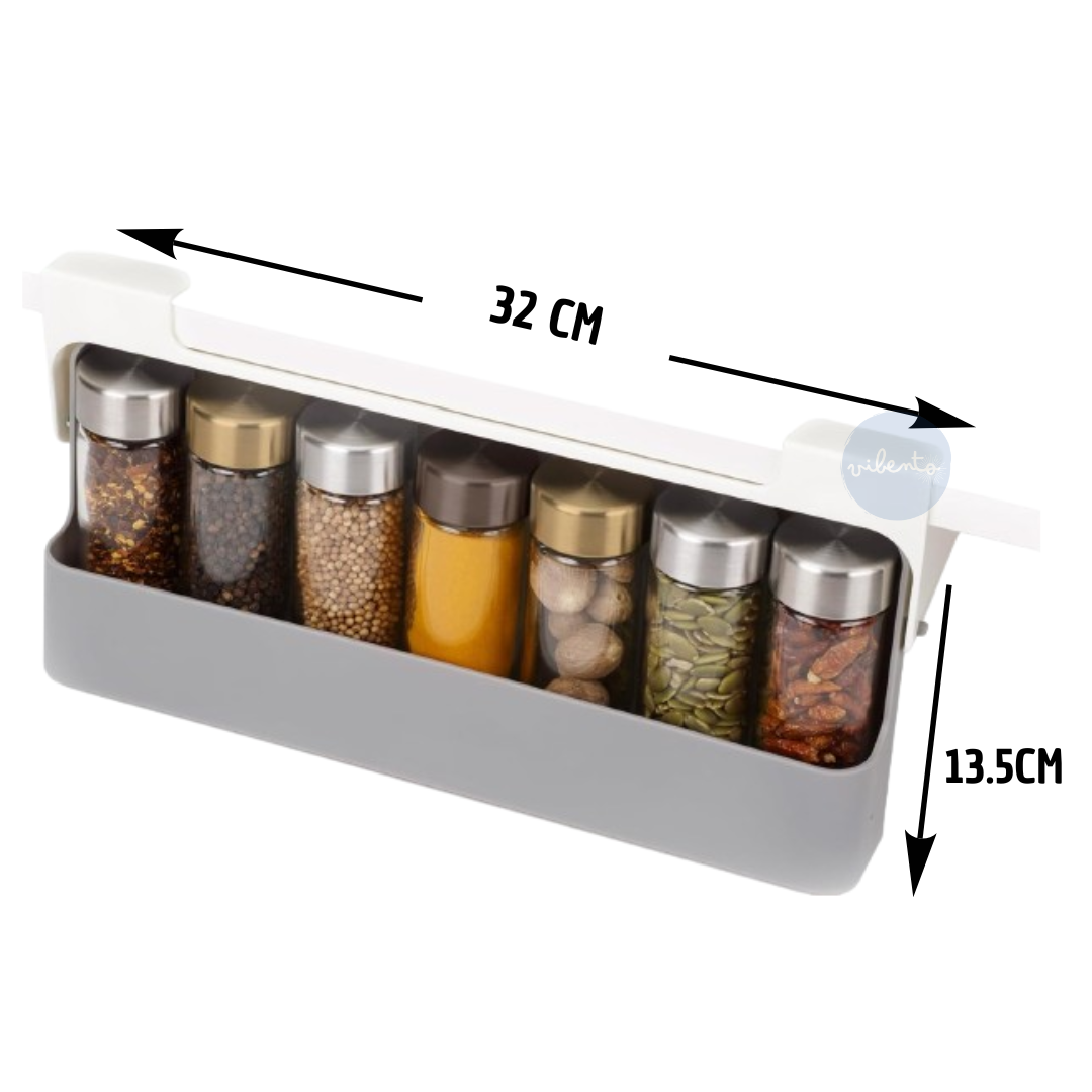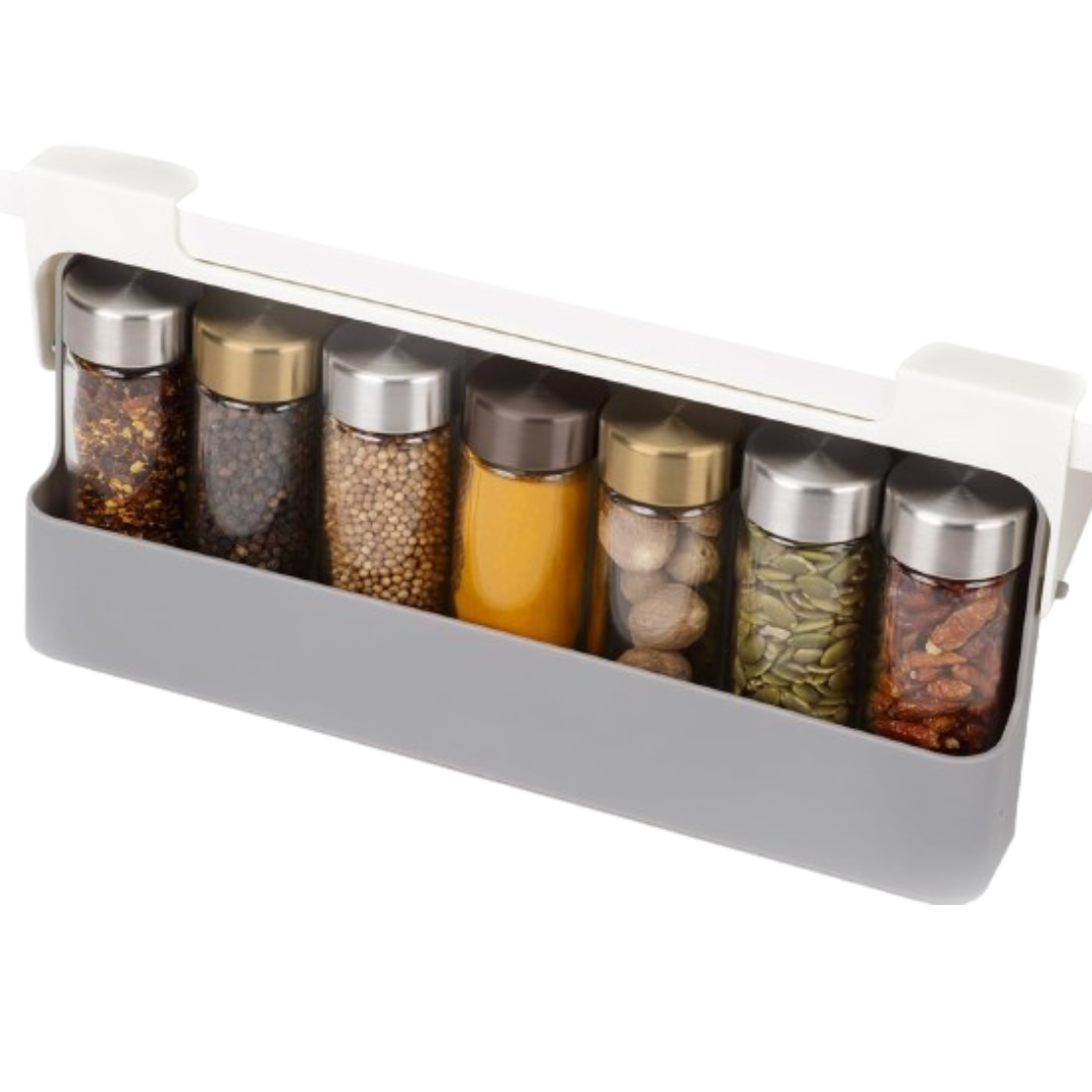Este organizador de condimentos es único en su diseño, utilizando el espacio no utilizado debajo del estante. Imagina tener tus especias favoritas al alcance de la mano sin ocupar espacio valioso en tus estanterías. Además, su compartimento extraíble con tope de cajón hace que acceder a tus condimentos sea más fácil y rápido que nunca.