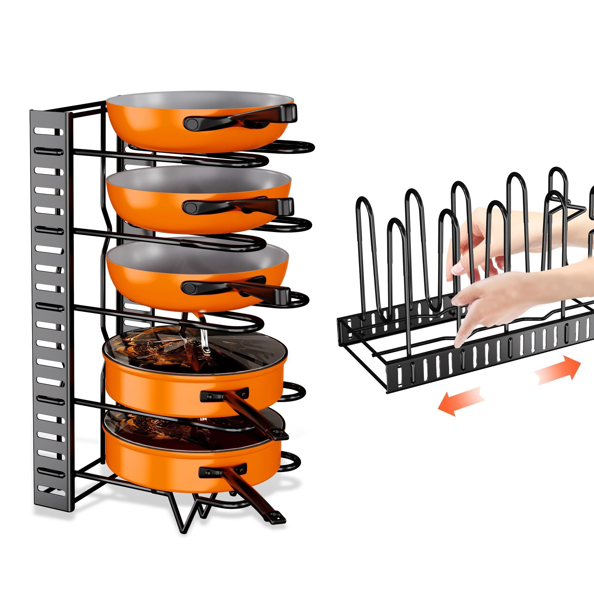 • El organizador ajustable de ollas y sartenes puede acomodar 5 ollas, freidoras, sartenes, tablas de hornear, tablas de picar, tapas de ollas, etc. Haz que sea fácil encontrar la olla que necesitas, ahorrando tiempo y energía valiosos.
