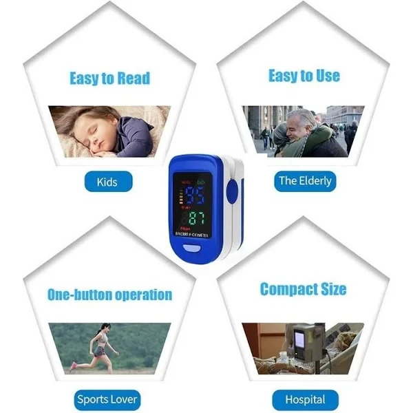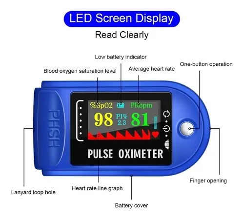Equipo para medir la saturación del oxígeno en la sangre y las pulsaciones del corazón a través del dedo, la SpO2 y el pulso pueden mostrarse correctamente en condiciones de perfusión baja. @@Apto para uso en casa, hospital, clínicas, cirugías, cuidados intensivos, rehabilitación deportiva, odontología y antes o después de realizar deporte, entre otras. Este dispositivo es capaz de leer SPO2 35-99%, pulsación 30-235 BPM y el gráfico de barras de frecuencia de pulso que indica la potencia de la intensidad del pulso / señal. @@Cuenta con un sistema de apagado automático incorporado, después de 8 segundos de haber quitado el dedo del dispositivo, este se apaga para una larga duración de la batería (BATERIAS NO INCLUIDAS). Se adapta a amplias gamas de tamaños de dedos.
