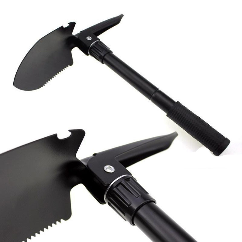 - Pala plegable para camping hecha de acero resistente, se pliega fácilmente y viene con un estuche de nylon con cremallera lateral para guardarla y transportarla.