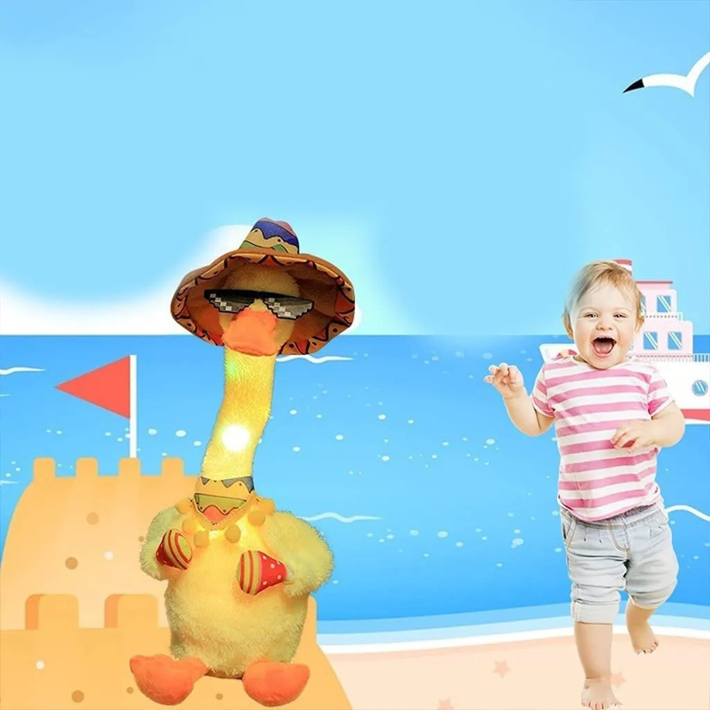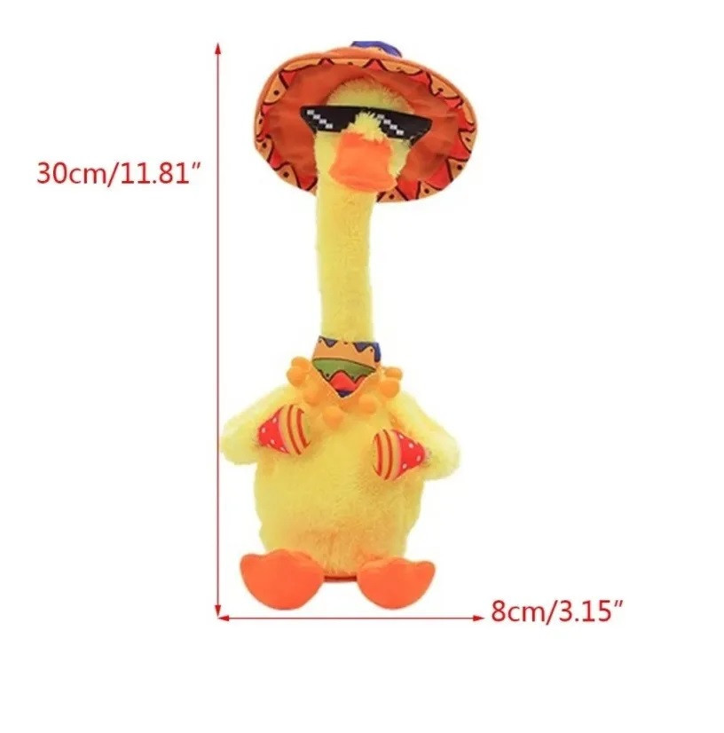Este bonito y divertido juguete de pato puede cantar, bailar y repetir lo que tiene dicho. Está diseñado con luces y aspecto divertido para brindarle mucha diversión a los niños. @@Diseño de costura suave para que sea pato realista y forma encantadora para que los niños jueguen, encienda la función de baile, el pato comienza a agitar y girar el cuerpo con la música. @@CARACTERÍSTICAS @@• Cuenta con 60 canciones integradas, canta y puede bailar. Un juguete perfecto para mantener a tus hijos entretenidos @• Mide aproximadamente 30cm/11,81 pulgadas de tamaño @• Este juguete requiere 3 pilas AA, que no están incluidas en el paquete @• Hecho con felpa de tacto suave,A yudar a usar su imaginación. @@POR TU COMPRA RECIBES: @1 x peluche eléctrico de pato