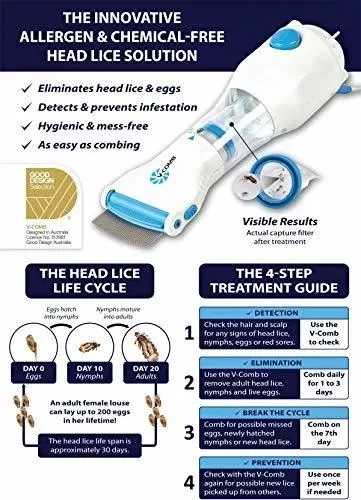 Presentamos el tratamiento natural para piojos más avanzado tecnológicamente y fácil de usar en el mercado actual. Ya no tendrá que someter a su familia a productos químicos o pesticidas que se encuentran en el champú para piojos u otros tratamientos para eliminar los piojos de la cabeza. Simple y fácil de usar, el V-Comb es un peine para piojos reutilizable y a prueba de alergias para niños y adultos. Este tratamiento suave, pero efectivo, es seguro para uso doméstico y elimina tanto los piojos de la cabeza como sus huevecillos (liendres) sin necesidad de productos químicos nocivos o champús especiales para piojos. Mientras que otros tratamientos para los piojos de la cabeza, como los champús químicos y los peines eléctricos, son más peligrosos para los niños pequeños y más duros para la piel y el cuero cabelludo, el V-Comb utiliza su peine redondeado con dientes de acero inoxidable y su potencia de succión para deslizarse suavemente por la piel. cuero cabelludo y levante suavemente los piojos y los huevos