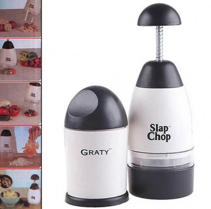 La Slap Chop hace que la comida se prepare mucho más rápido cortando tus frutas y verduras favoritas en segundos. Simplemente golpeando el émbolo hacia abajo, puedes picar y cortar alimentos tan bien como necesitas para todas tus creaciones de cocina. Sin cuchillas de conmutación. Las cuchillas giratorias de acero inoxidable giran con cada empuje del émbolo moviendo la comida para que no tengas que hacerlo. El Slap Chop se abre fácilmente para una limpieza profunda y es apto para lavavajillas. Haz que tus comidas sean más creativas y pase menos tiempo cortando.