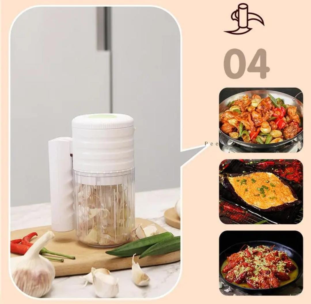 - Aplicación Universal:La picadora de ajo eléctrica es adecuada para cocinas y restaurantes, ideal para viajes, camping y picnics. Es aplicable para triturar jengibre, pimientos, cebollas, etc.