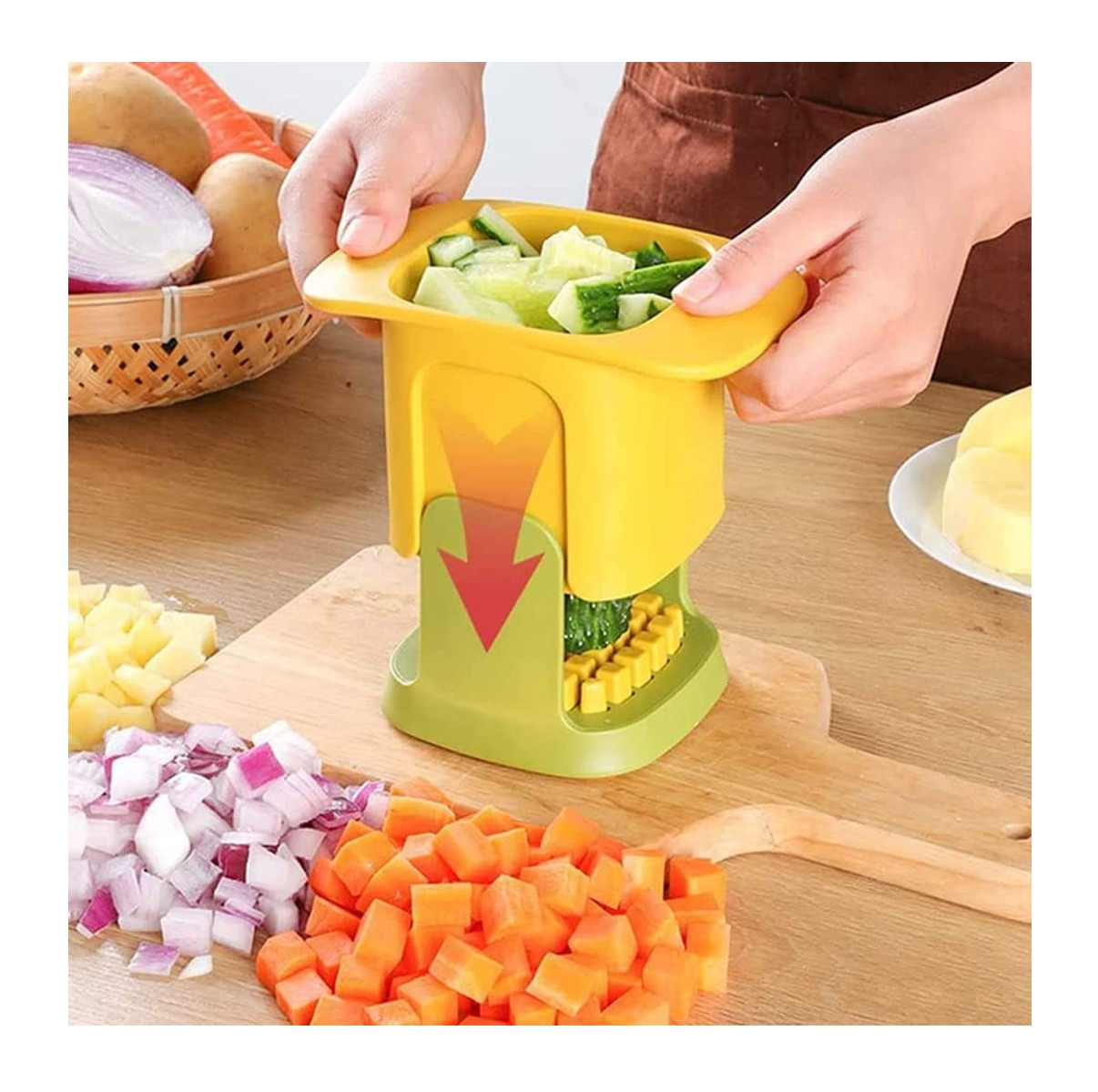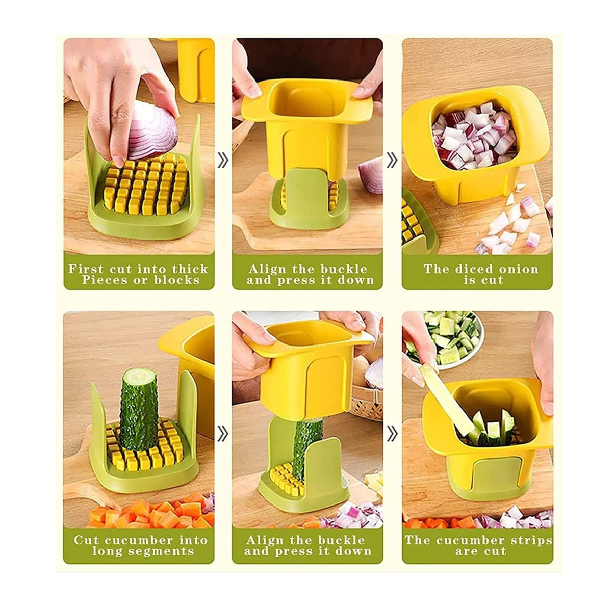 •Cortador de verduras 2 en 1 para cortar y cortar: no hay necesidad de cortar con frecuencia, simplemente presiona el cuchillo de cocina ligeramente, puedes cortar o cortar en dados y cortar, el corte en cubitos es limpio y cuadrado, lo que es más hermoso que cortar a mano.