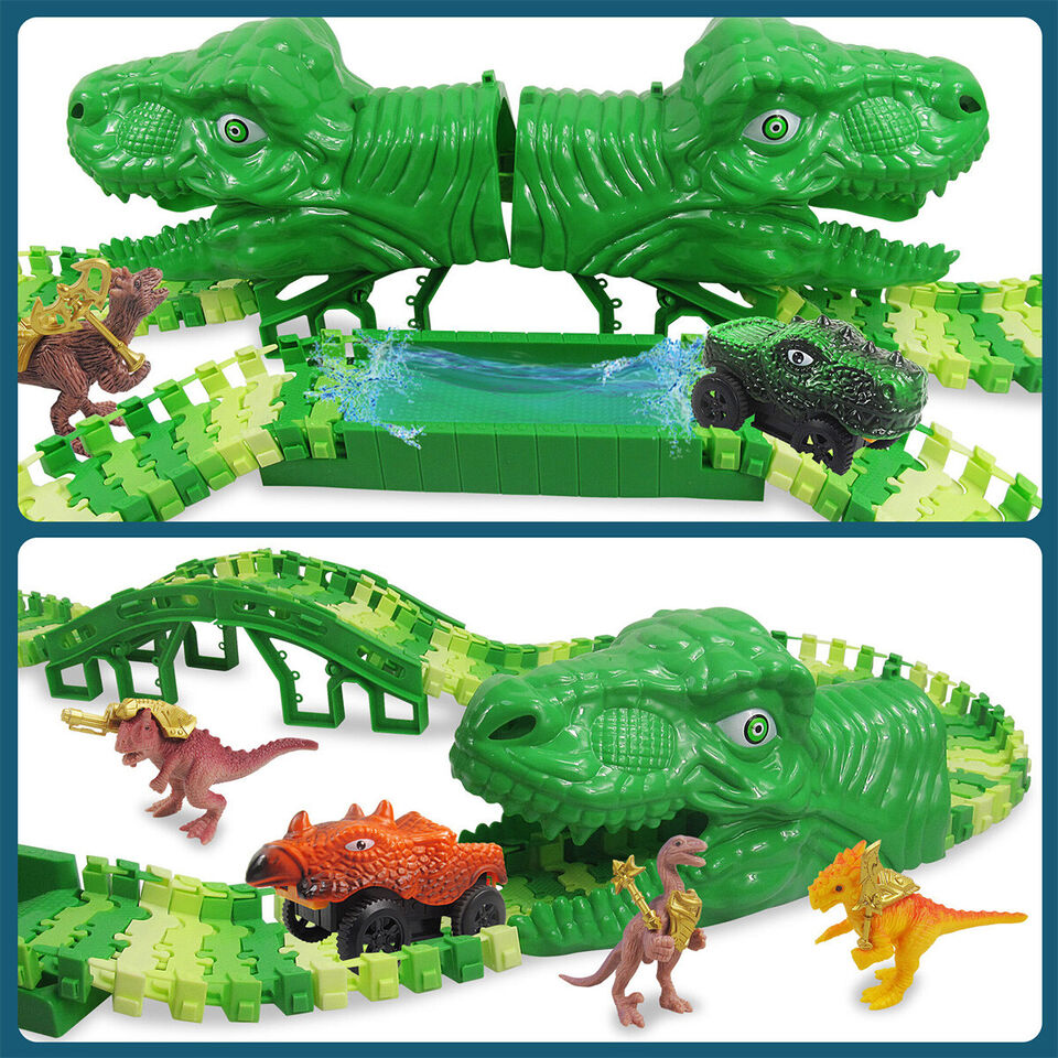 Pista con jeep dinosaurio – Cambia la forma de la pista – Túnel Cabeza dino 2– 8 dinosaurios – Incluye 130 piezas – Accesorios de la naturaleza – Armado simple – Edad: +3 años – Funciona con 1 pila AAA