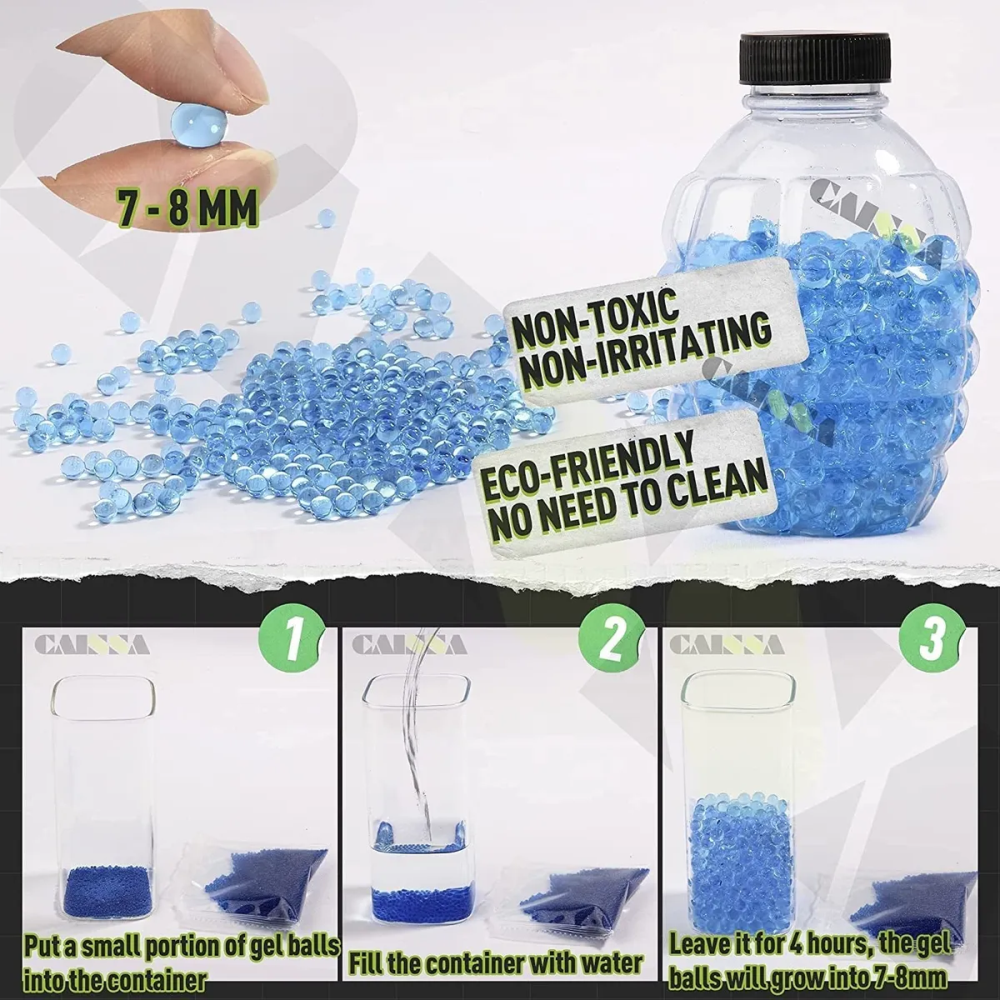 Arma de gel inofensiva: Utiliza cápsulas de gel a base de agua. Remoja las pequeñas bolas de gel ecológicas en agua y observa cómo se expanden hasta el tamaño. Las cápsulas se desintegran completamente una vez secas. No manchan la ropa. El arma de juguete recargable dispara bolas de gel de agua. Al igual que la pistola de agua común, el lanzador de dardos con ventosa, este es un rifle de juguete seguro que no causará daño a personas u objetos.