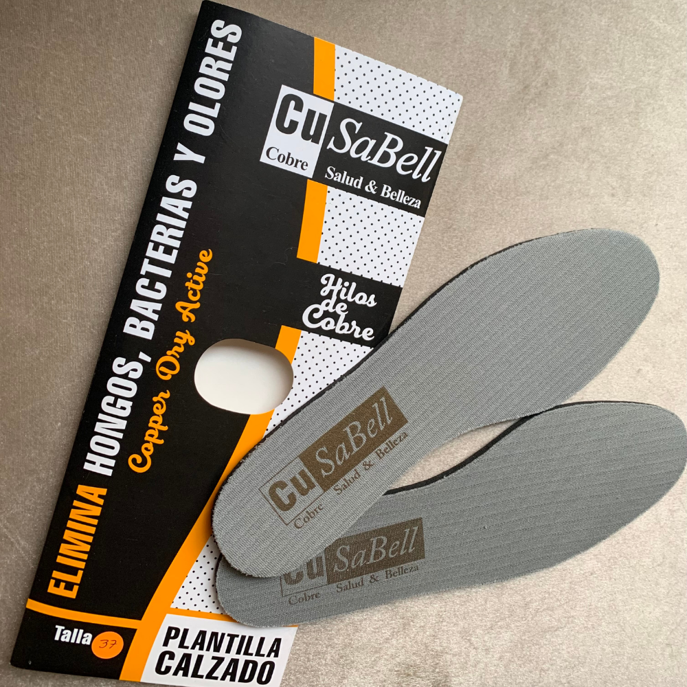 Las plantillas para todo tipo de calzado, elaboradas con hilado de cobre puro, favorece la evaporación de la humedad, evita el sudor, elimina y previene los malos olores, hongos y bacterias en los pies. Ayuda a la buena circulación y en la disminución de dolores en los pies.