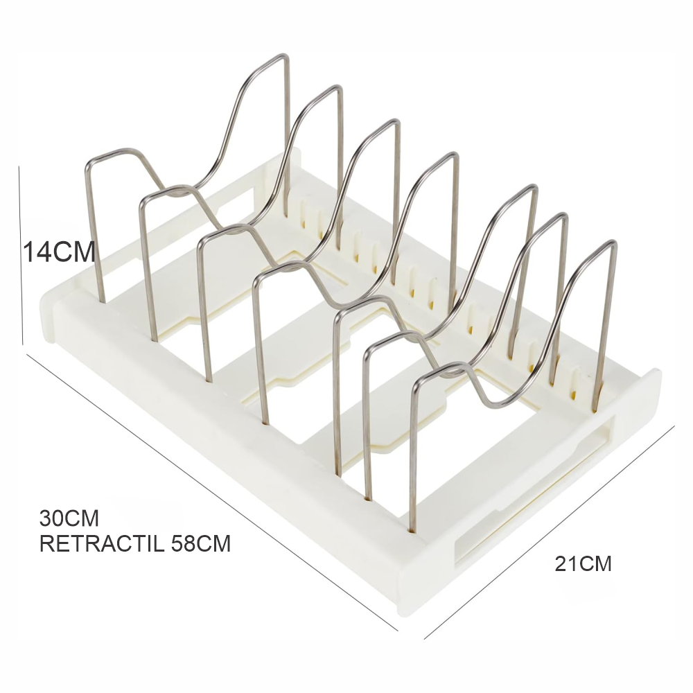 El estante para ollas es un dispositivo de almacenamiento ajustable que se puede extender hasta 60cm de longitud y contraer hasta 30cm . Además, tiene un total de 7 marcos de soporte, y puedes ajustar la longitud y el número de soportes de montaje de acuerdo a tu uso.