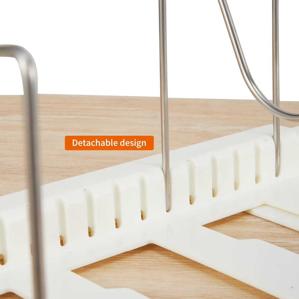 Cada marco de soporte está fundido de acero inoxidable 304, resistente a la corrosión y al óxido, con un diseño de ranura en forma de U, bordes lisos y esquinas que no dañan tus manos, por lo que es más fácil almacenar y colocar la cubierta de la olla. La base está hecha de plástico de alta calidad, que es fácil de limpiar y almacenar sin dañar la superficie de la sartén.