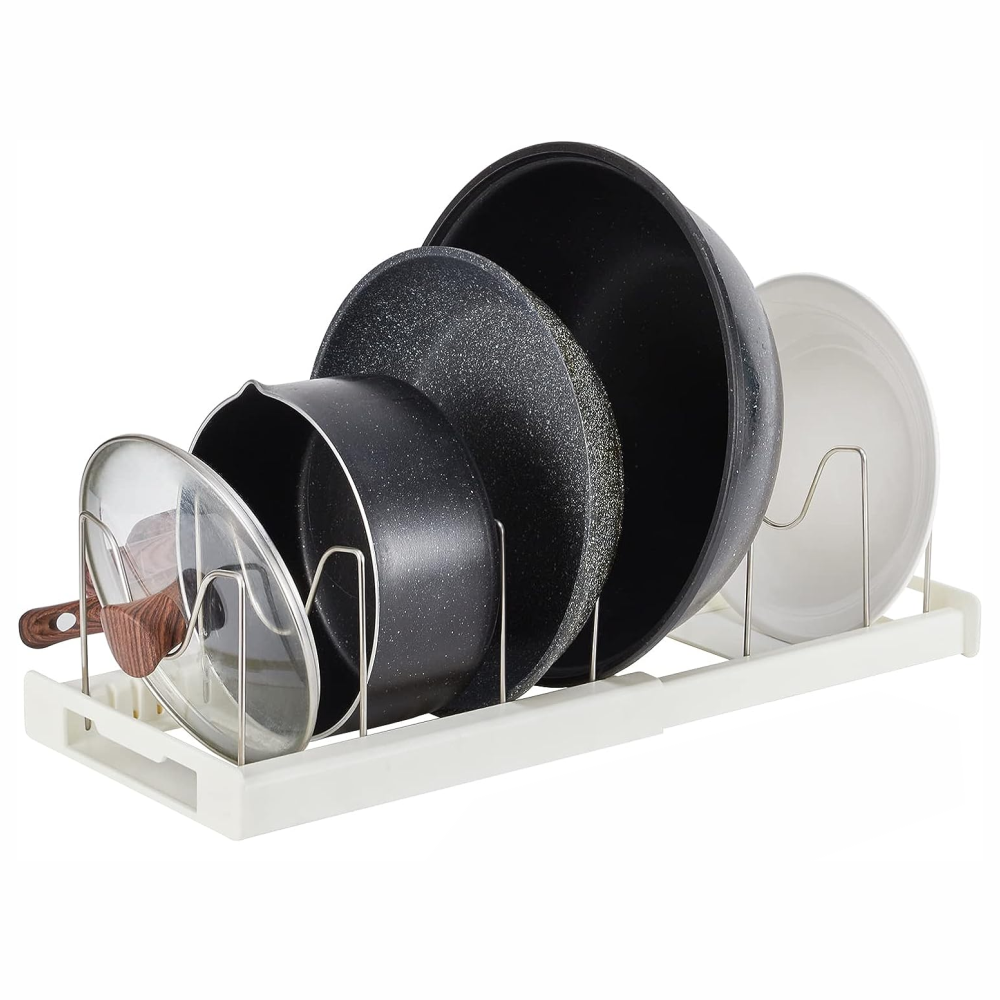 Este estante para ollas está equipado con 7 marcos de soporte, y cuando la base está desplegada, hay 30 pares de clips. No solo puede almacenar tapas de ollas, platos, todo tipo de sartenes, sino también herramientas para hornear, carpetas, cristalería, etc. Ahorra espacio de forma eficaz.