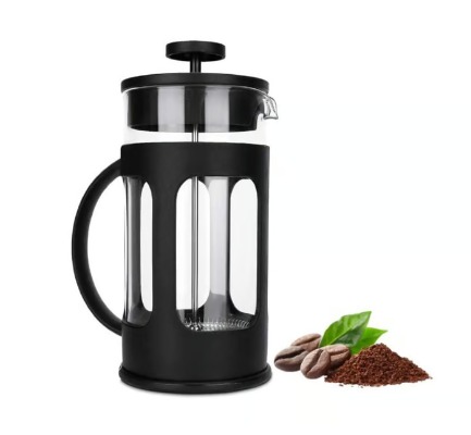 Cafetera francesa de vidrio con soporte de polipropileno resistente a altas temperaturas y filtro de acero inoxidable (contiene instrucciones de uso).