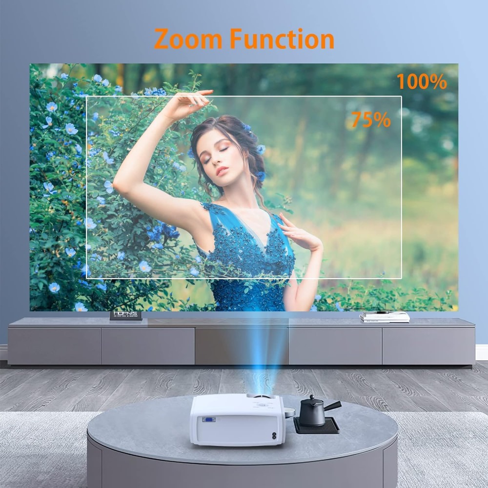 Función de zoom y pantalla grande: con la función ZOOM, el proyector de iPhone Febfoxs puede reducir el tamaño de la imagen al 75% sin moverse. Con un diseño que ahorra espacio, instalación rápida y fácil, y la capacidad de ajustar tu proyección de entre 50 y 250 pulgadas sobre la marcha, puedes disfrutar de una experiencia cinematográfica desde la comodidad de tu propia casa La distancia mínima recomendada es de 2 metros.