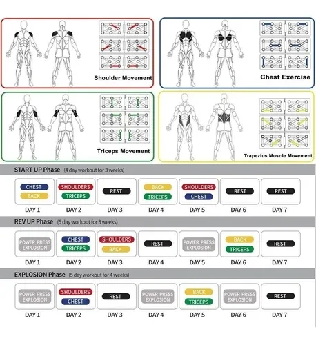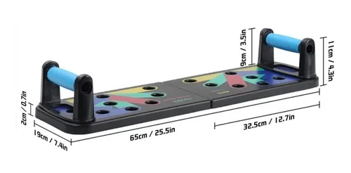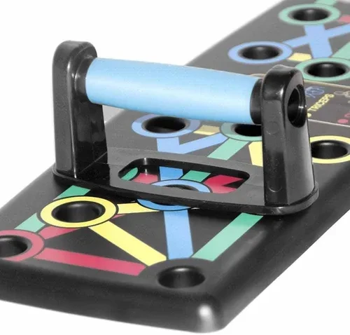 Accesorio super practico y versátil para reforzar tu rutina de ejercicio en casa. @Inserta las empuñaduras de acuerdo con la zona a ejercitar según color: @-Zona amarilla: espalda @-Zona azul: pectoral @-Zona verde: tríceps @-Zona roja: hombros @-Mango fuerte hecho de plástico @-Puede prevenir resbalones sin preocuparse por el sudor. @-Cuerpo de placa de refuerzo @-La parte inferior está reforzada @-Resiste 100 kg. @@* CONTENIDO: @-1 Tablero plegable. @-2 empuñaduras. @-Manual de entrenamiento.