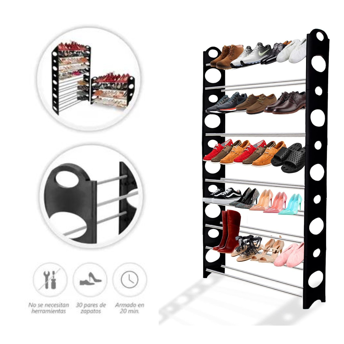 • Acomoda hasta 30 pares.