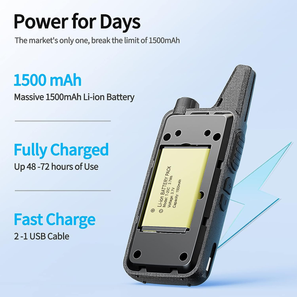 Cada walkie talkie con batería recargable de iones de litio de 1500 mAh, no necesita comprar y desechar las baterías una y otra vez como otros walkie talkies, más económicos, ecológicos.