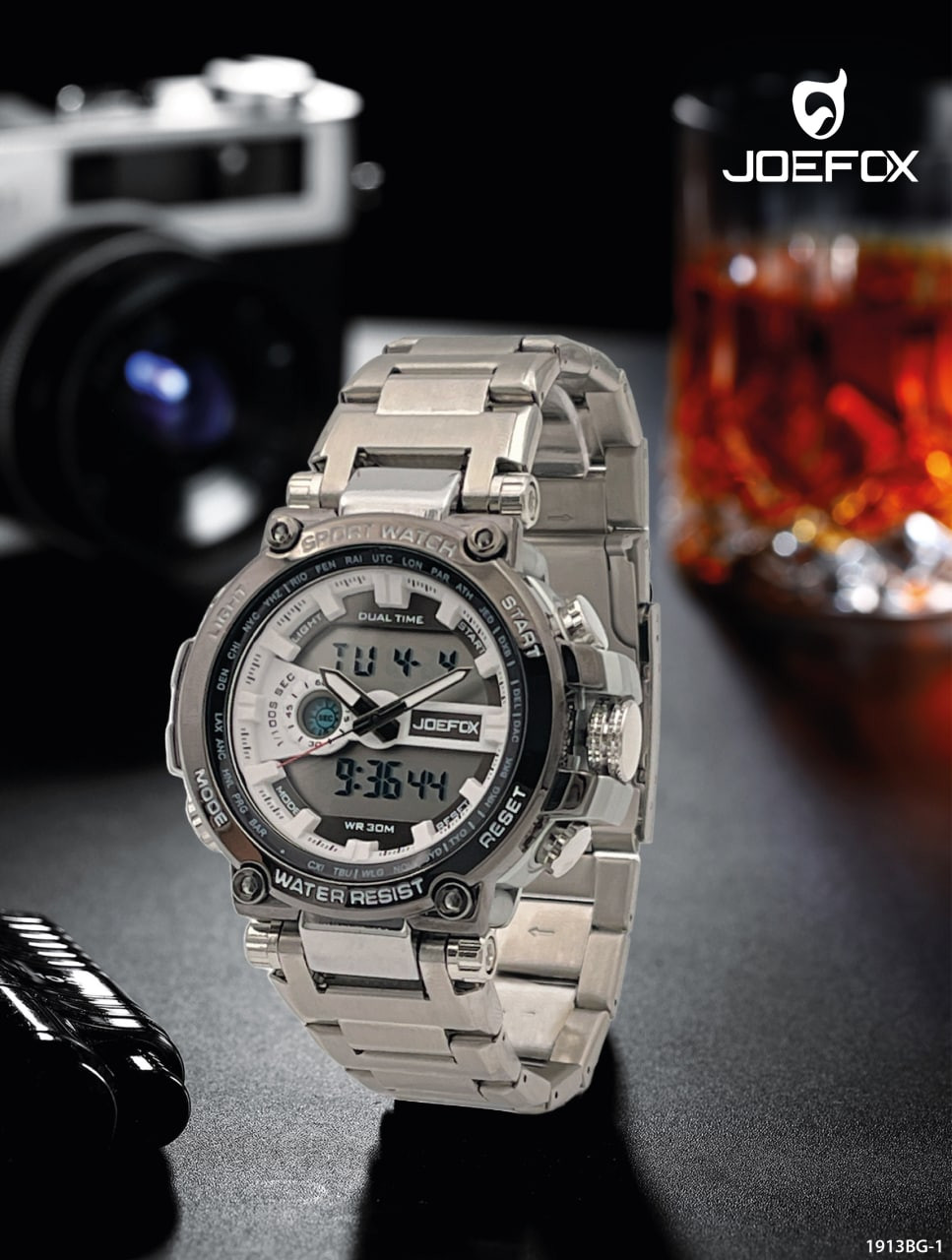 – Hora análoga y digital, cronómetro, calendario, luz y alarma.