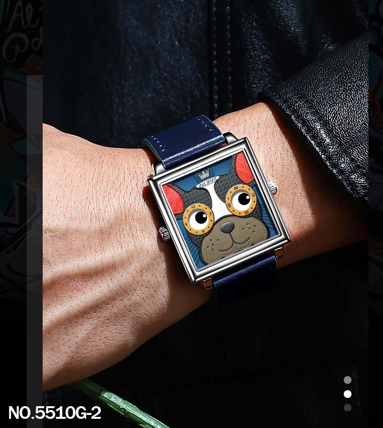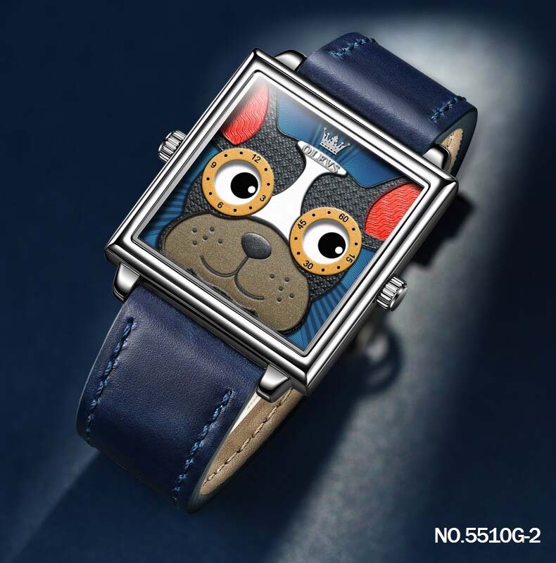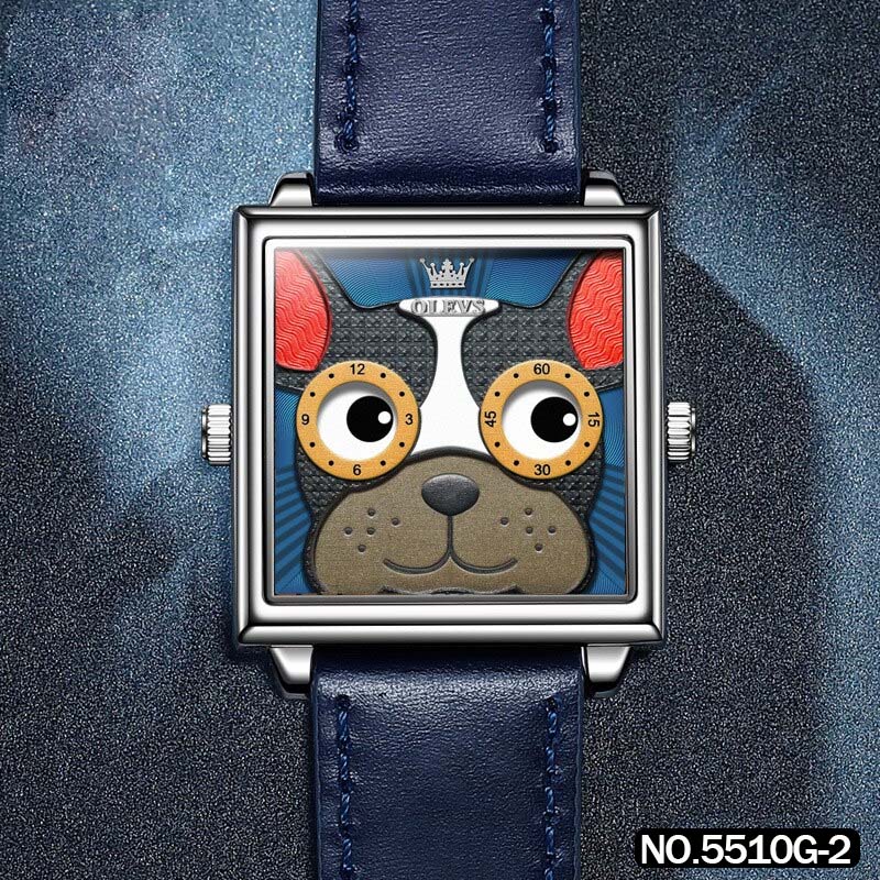 El Reloj Olevs 5510G es un reloj con caja metálica cuadrada y un diseño único en su tablero que presenta a un perrito Shiba Inu y un Bulldog Francés