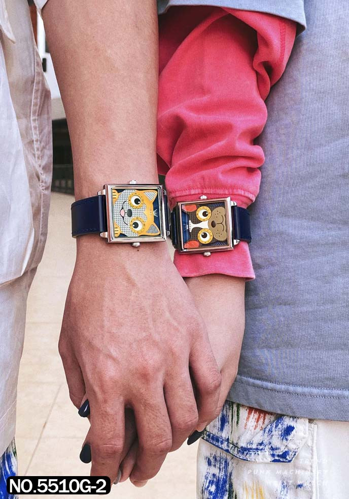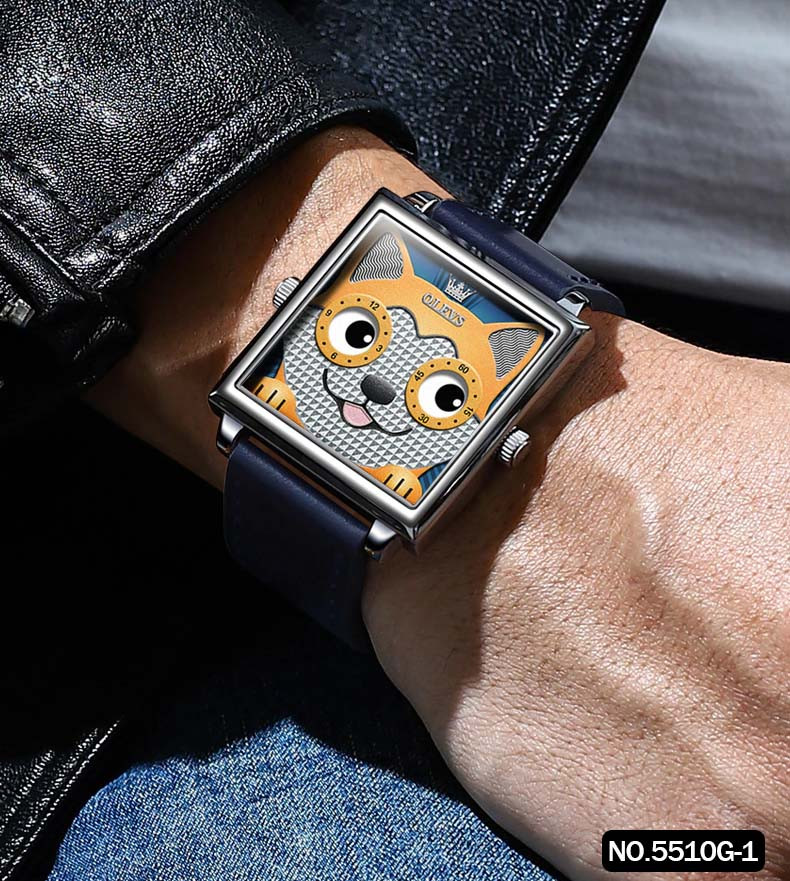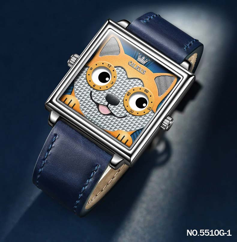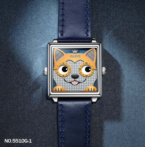 El Reloj Olevs 5510G es un reloj con caja metálica cuadrada y un diseño único en su tablero que presenta a un perrito Shiba Inu y un Bulldog Francés