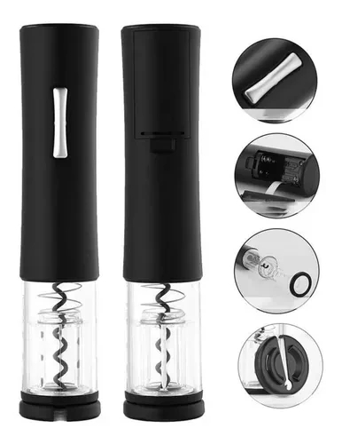 Descorchador o sacacorchos eléctricos ¡Fantástico para los amantes del vino! Diferente del clásico abridor de botellas de vino, sólo tiene que presionar los dos botones, puede quitar el corcho en 6 segundos, el abridor no romperá el corcho y puede sacarlo dentro de 8 segundos automáticamente. Perfecto para el hogar, bar y uso comercial. Un buen regalo para su familia, amigos y socios. @@CARACTERÍSTICAS Y ESPECIFICACIONES: @• Abra el vino en 6 – 8 segundos @• Cortador de papel incluido para quitar sellos fácilmente. @• Diseño ergonómico y con un botón pulsador. @• Diseñado con la tapa de sacacorchos transparente para ver el cierre. @• Broca de calidad alimentaria abre hasta 50 mm de tapón de vino. @• Fácil de transportar, almacenar y usar.@• Funciona con 4 pilas AA alcalinas (NO INCLUIDAS). @• Se recomienda que las pilas sean alcalinas de excelente calidad. @• Puede utilizar baterías recargables. @• Material: ABS. @• Color: negro. @• Tamaño: 26,3cm * 5cm. @• Ideal para tu casa, fiestas, bares, hoteles, clubes, familia y otras bebidas. @• Regalo perfecto. @@COMO USARLO: @- Utiliza el cortador para remover el plástico protector en el cuello de botella. @- Sostén la botella y presiona la punta del sacacorchos sobre el corcho mientras presionas el botón inferior. @- Una vez que el corcho esta completamente atornillado, puedes removerlo levantando el sacacorchos. @- Oprimiendo el botón superior expulsa el corcho.