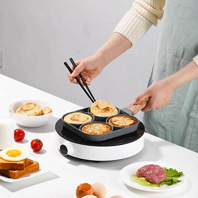 5. Múltiples usos: la sartén se puede utilizar para hacer tortilla, hamburguesa y similares, y la sartén cuenta con 4 compartimentos para hacer la cocción rápida y fácil.