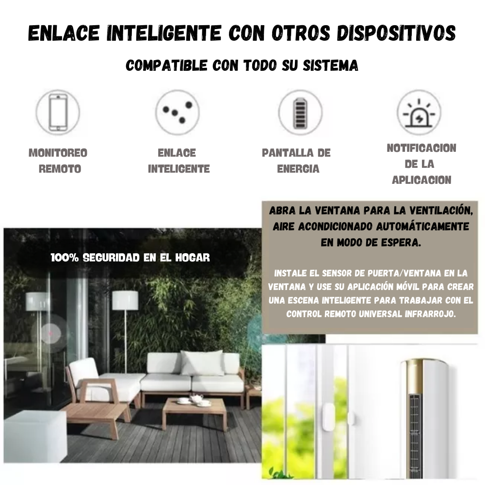 Compatible con ALEXA, GOOGLE y TUYA, con notificaciones a tu celular y alarma sonora ajustable en 4 niveles, se puede silenciar desde el teléfono.