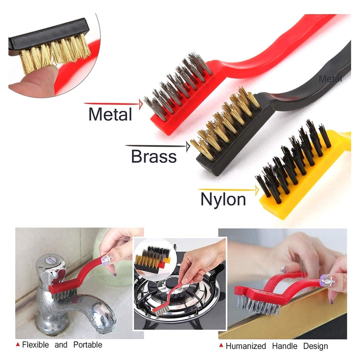 ¡Todos nuestros cepillos sirven para diferentes propósitos! Puede utilizar el cepillo de alambre de acero inoxidable para eliminar el óxido, mientras que el cepillo de nailon es perfecto para electrodomésticos delicados. El cepillo de latón es ideal para limpiar superficies metálicas sin rayarlas
