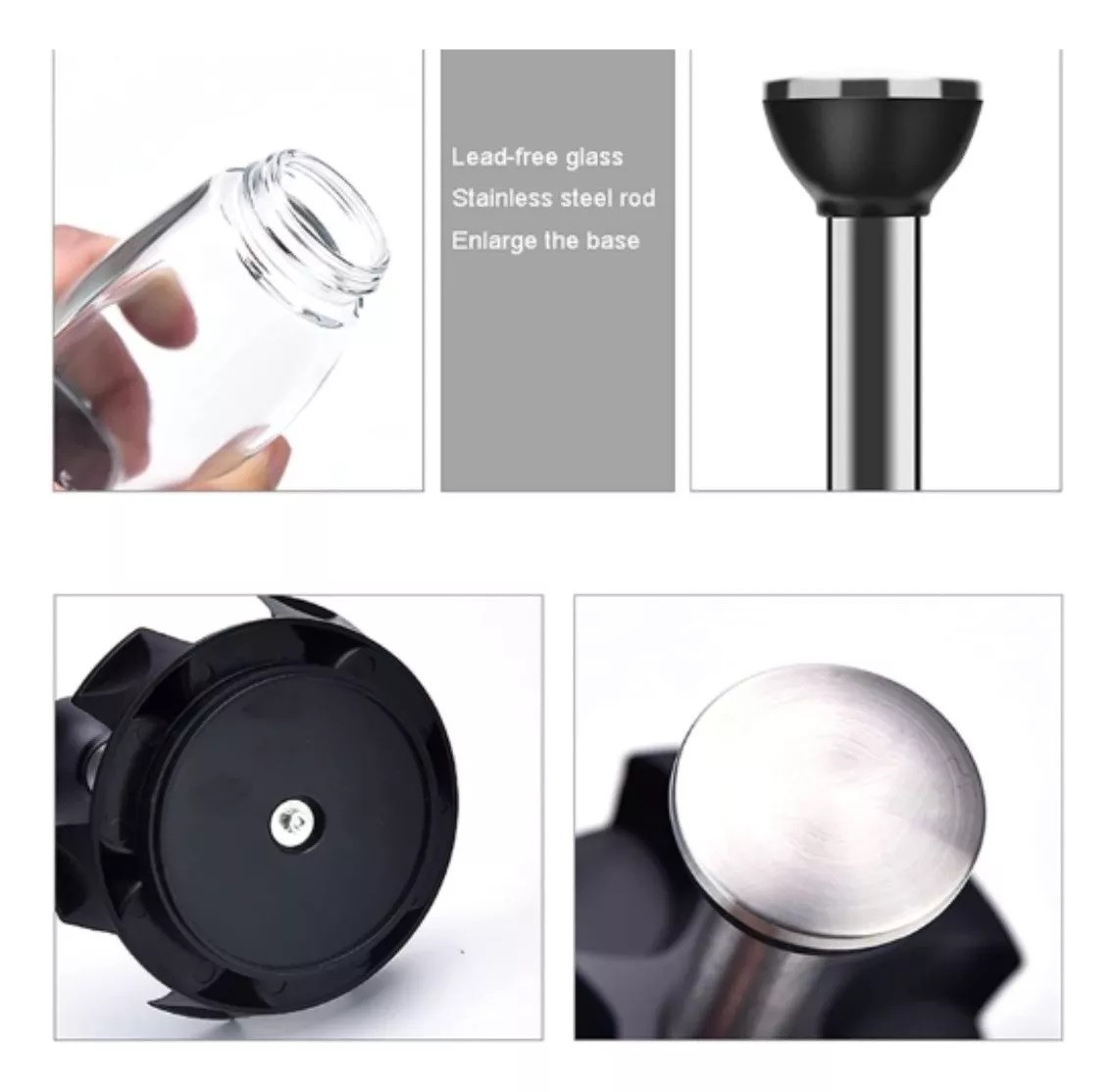 Material: cuerpo de cristal + tapa de plástico + acero inoxidable.