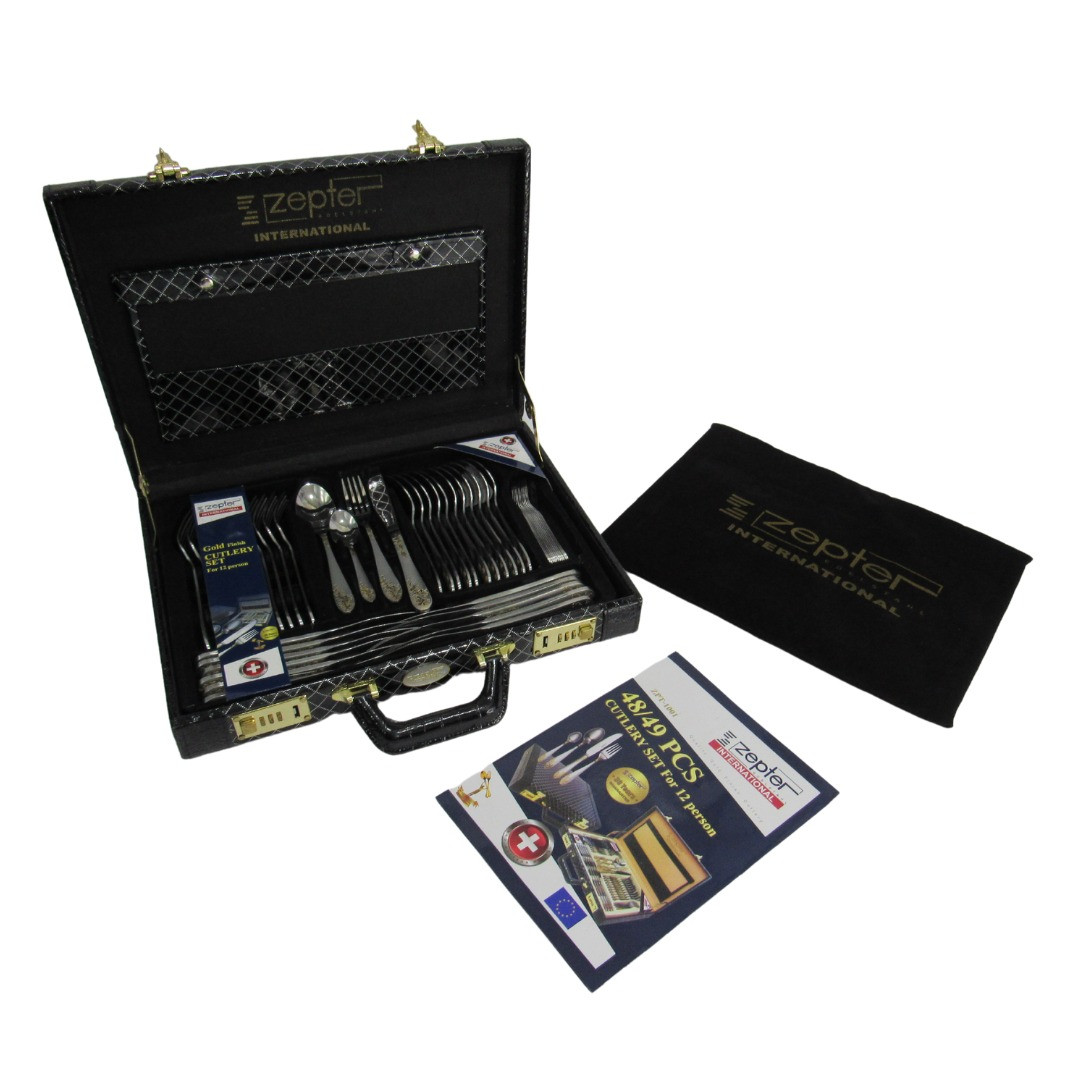 El paquete incluye: 12 Tenedores de mesa, 12 Cuchillos de mesa, 12 Cucharas de mesa y 12 cucharas de te