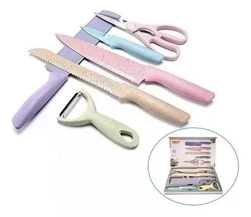 Un completo set de cuchillos de cocina que además de su presentación elegante facilitaran la preparación de tus alimentos, cada cuchillo tiene un uso en particular y esto evita que se mezclen los sabores de la comida, como cuando usas el mismo cuchillo para cortar cebolla y luego frutas; ahora podrás pelar, picar, trocear de una manera más práctica y también eficiente.