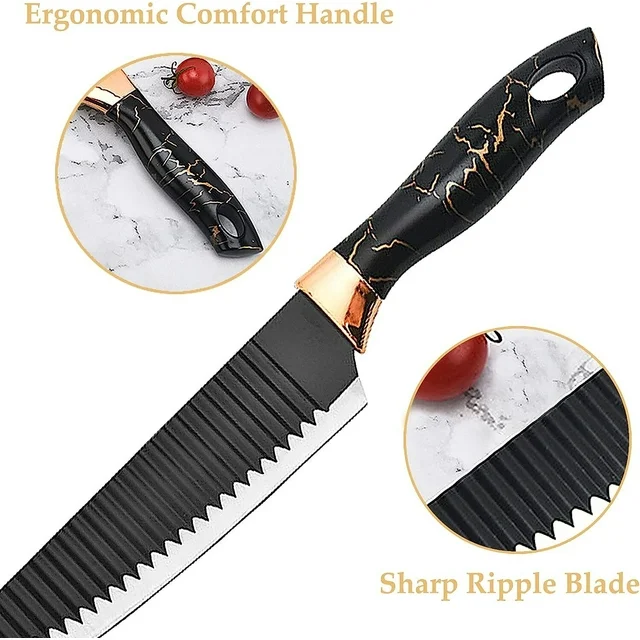El revestimiento de metal del juego de cuchillos de acero inoxidable mejora el efecto antiadherente, haciendo que cortar y limpiar sea muy fácil. El revestimiento también puede prevenir eficazmente la corrosión y el óxido.