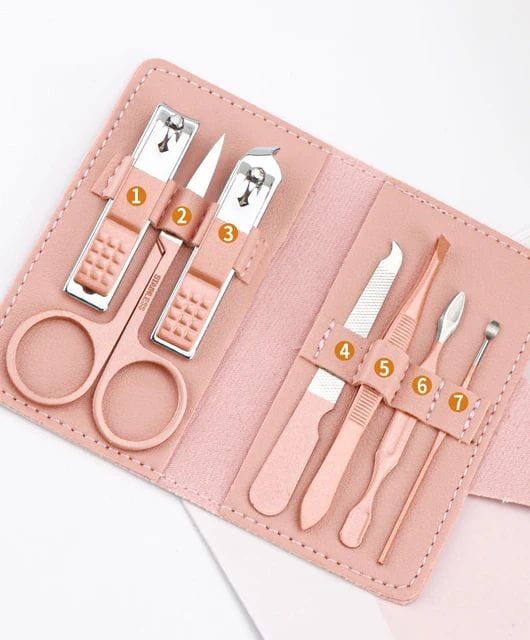 Ofrecemos un set de manicura en un estuche rosa que consta de 7 piezas de alta calidad. Este completo kit incluye cortaúñas, limas de uñas, pinzas, tijeras y más, proporcionando todo lo necesario para un cuidado completo de tus uñas. El estuche es elegante y práctico para llevarlo contigo donde sea que vayas, asegurando que tus uñas siempre luzcan impecables. Invierte en tu apariencia y comodidad con nuestro set de manicura.