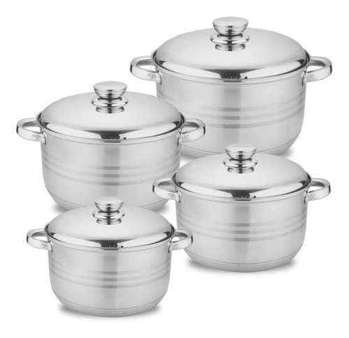 La batería cuenta con un termo-difusor de calor que distribuye de manera uniforme el calor a toda la olla así la llama del fogón sea pequeña todas las piezas de las ollas son 100% acero quirúrgico tanto las manijas como las tapas,